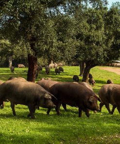 - El jamón proviene de cerdos de raza ibérica criados en campos y alimentados a base de hierbas aromáticas, leguminosas y cereales naturales, ricos en sodio, fibra y proteínas. En el corte se pueden apreciar pequeñas «motas» o «cristales» de color blanco, señal de una curación lenta y una baja salinidad.